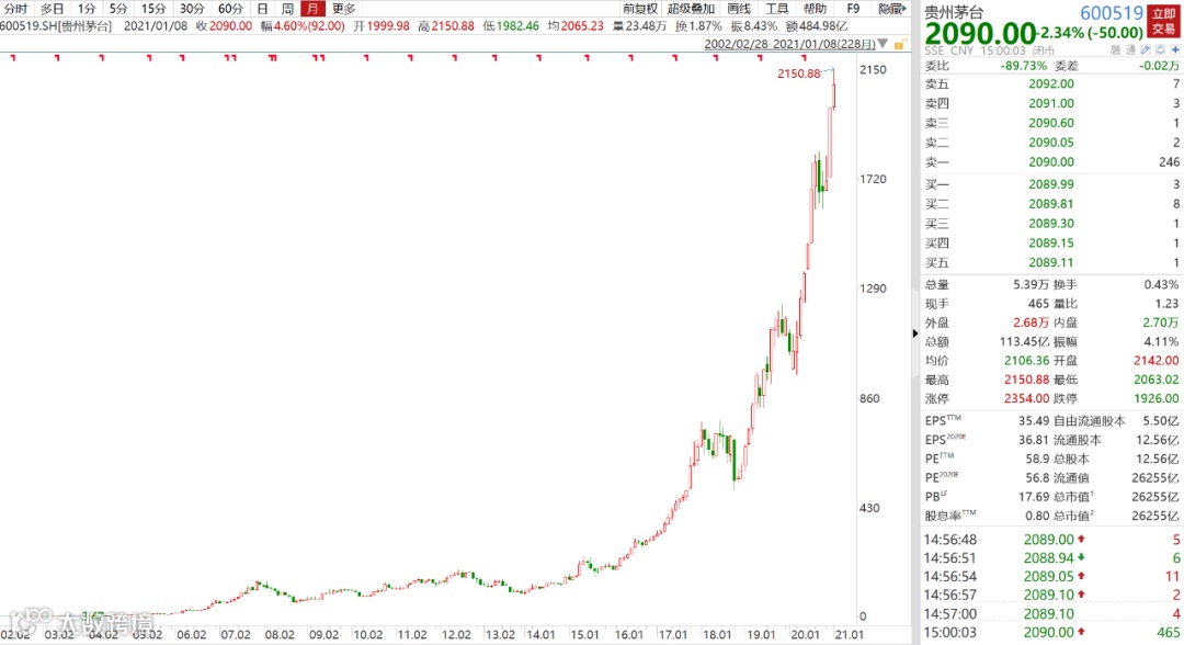 1月4日,茅台股价在盘中一度冲上2000元/股,1月5日,一鼓作气站上2000元大关,当天大涨超3%,随后继续高举高打,短短2天后,直接逼近2100元,8日盘中再创历史新高达到2150.88元/股。