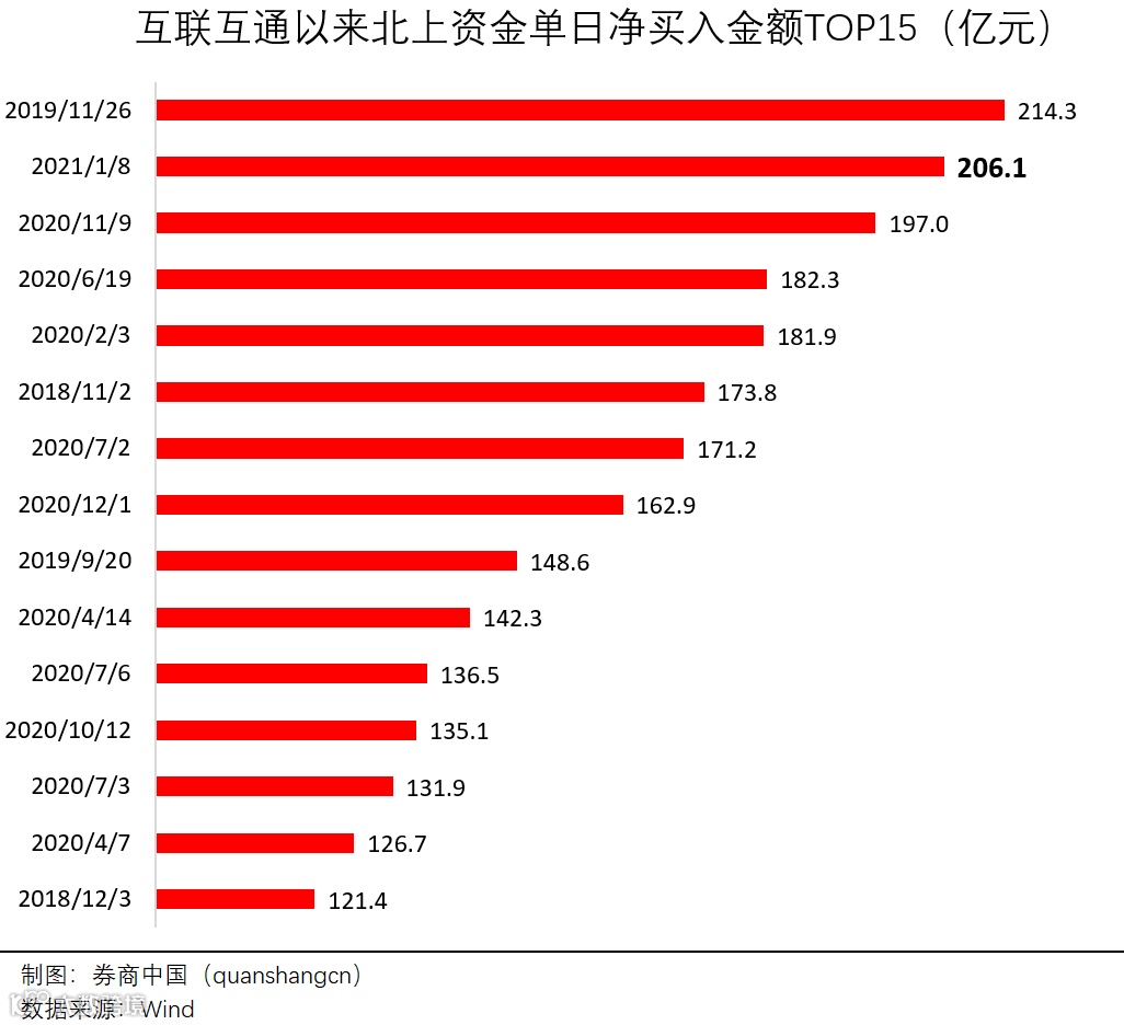 尽管大盘涨势暂停,但外资的热情却未消减。1月8日,北向资金大举净流入,全天净买入超200亿元,创下历史次高纪录。单日历史最高净流入额为2019年11月26日,当日北上资金净流入214.3亿。