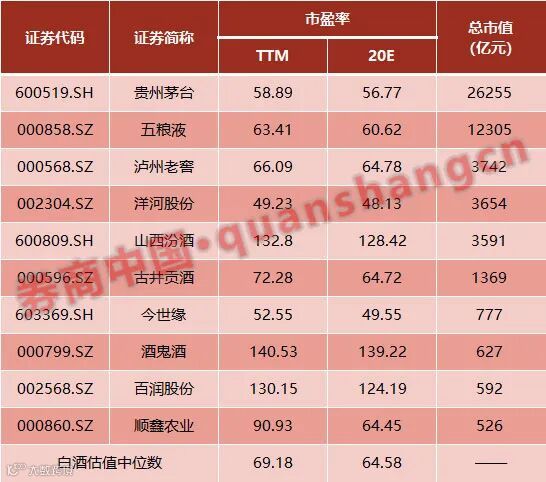 另外,若将茅台与A股其他白酒进行对比:市值TOP10的上市公司中,市盈率(TTM)几乎都超过了50倍,中位数为69.18倍,茅台的估值低于大部分酒企,也低于行业估值的中位数。