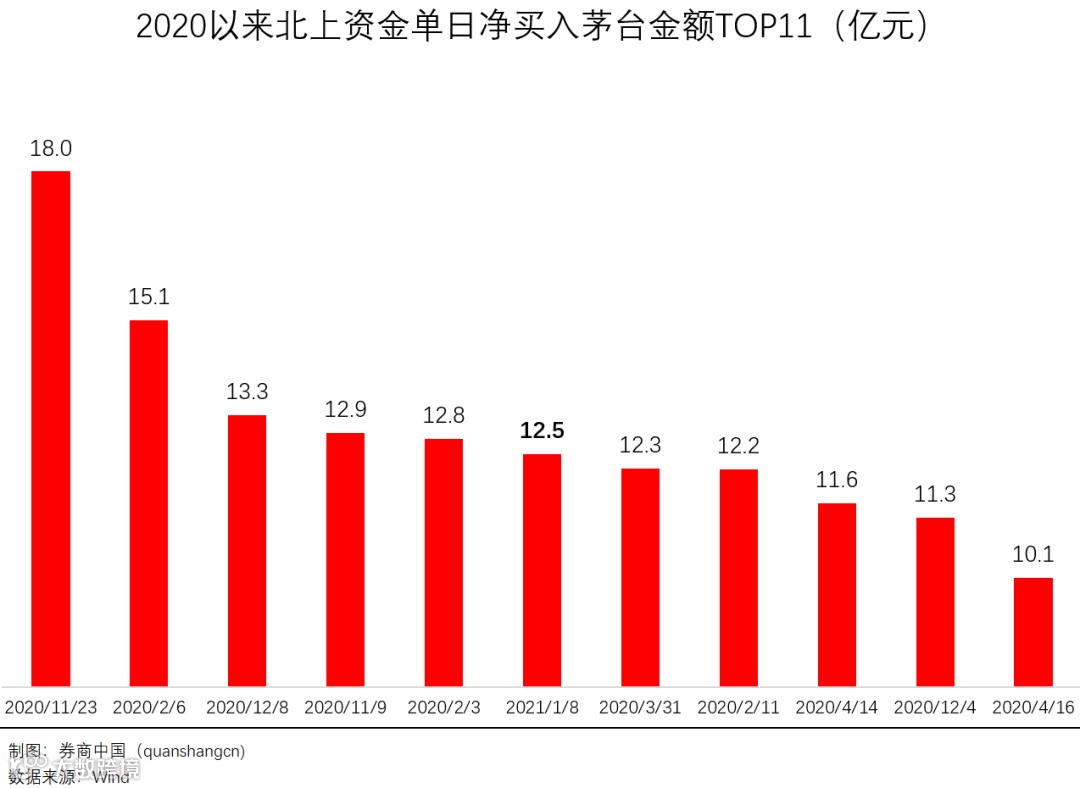 券商中国记者通过Wind数据查询了2020年1月1日至今的数据,北上资金单日净买入茅台超过10亿元仅有11次,净买入最高的一天是2020年11月23日,净买入了18亿元,而12.53亿元位列第6位。