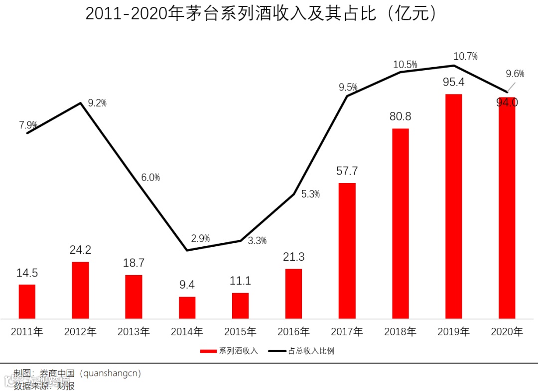 据财报显示,2018年以来,茅台的系列酒收入占比维持在10%左右,2020年约为9.6%。
