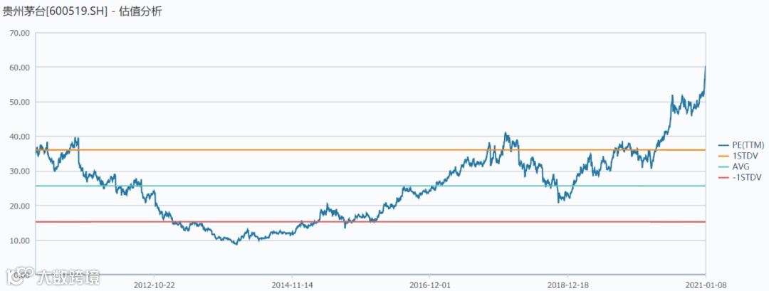 截止1月8日收盘,茅台的最新市盈率(TTM)已达到58.9倍,若以2020年预期净利润455亿元计算,其市盈率(TTM)也达到了57.7倍。