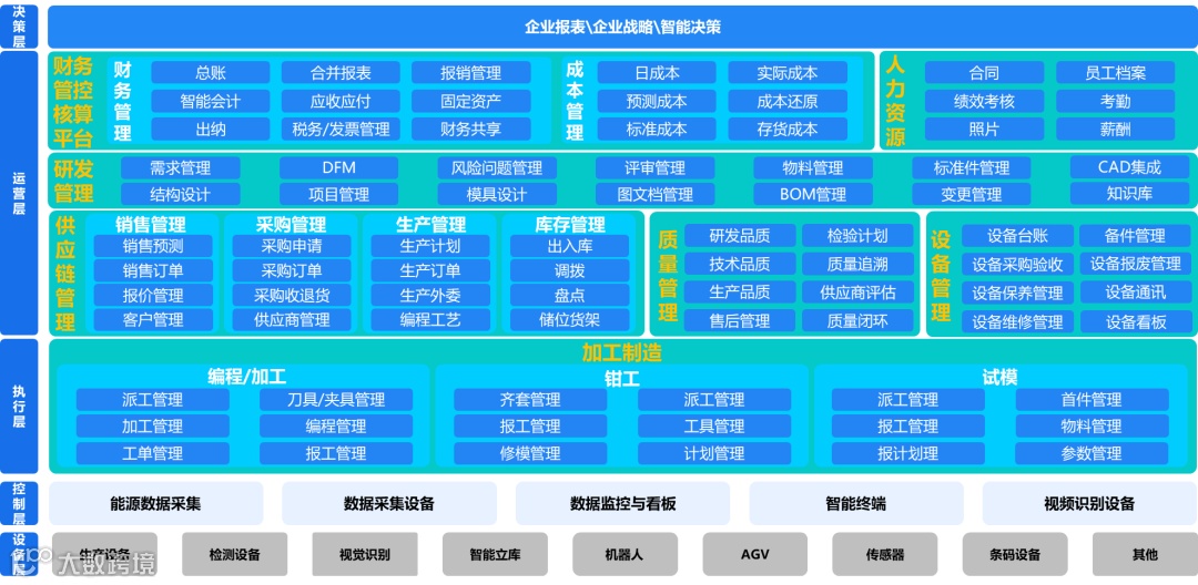 模具制造过程中,大量的工作量集中在机加工阶段,所以,模具工厂的机加工种类非常多,随着工业技术的发展,目前大部分机加工厂都已经有了数控设备,当然,这些工厂可能大规模地在使用传统手摇设备,但是,数控设备在精加工阶段的作用不可替代。这样,设备管理在整个工厂管理中也是非常重要的一个环节了。设备管理不仅仅包含了传统的设备台账、设备生命周期、设备备件的管理,更重要的是,对于数控设备,通常有对外的数据接口,系统可通过接口对设备进行监控,获取设备状态等即时信息,甚至对设备进行反控。