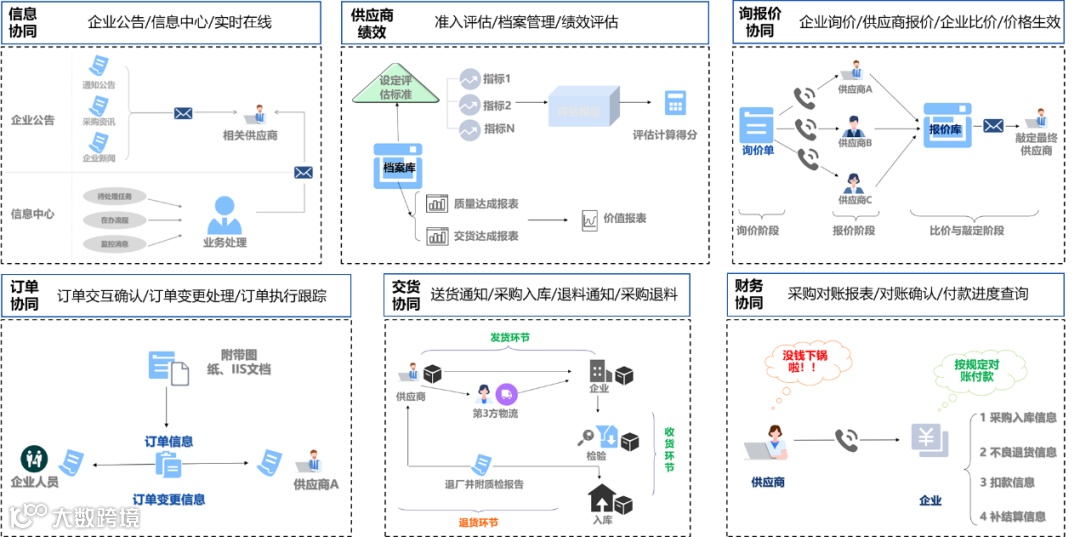 供应商协同,包含了信息协同,企业可以从供应商信息平台获取供应商产能,标准物料库存等信息;询报价协同,可以快速沟通获取报价,并进行比价;订单协同,对于需要生产的非标物料,可通过供应商共享信息,实时获取采购订单对应的加工进度等信息;交货协同,可快速识别送货单,扫码检验并入库。