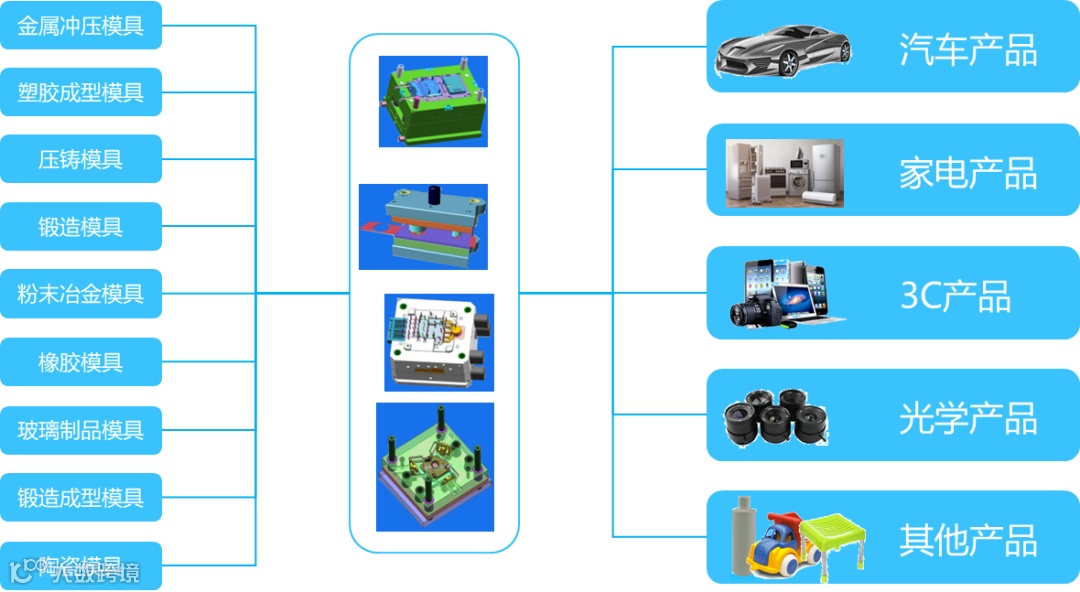 模具的产业链,上游:通过各种机加设备,加工模具零件,因为模具是由多个零件装配而成的,每个零件都需要通过不同的工艺加工出来;中游:将零件装配成整模,试模,当一套模具零件齐套之后,有专门的装配人员将模具零件装配成整模,之后试模;下游:通过模具成型出来的产品零部件,应用在产成品的组装过程。
