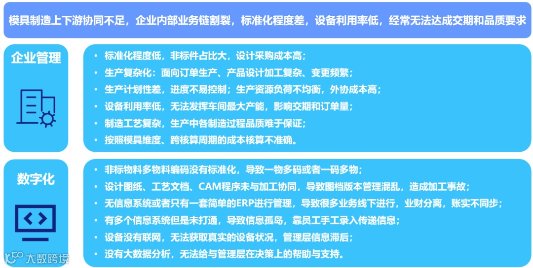 终端产品的准时发布,给产业链上游模具的交期带来了巨大的压力;多种数控设备无法有效利用,多数依靠员工手工的作业模式,导致模具工厂生产效率低下;工厂管理的落后,导致运营效率低下,异常频发,成本激增;客户产品的变更频繁,工厂内业务链无协同,导致变更响应迟缓,造成质量和工期的浪费,等等。
