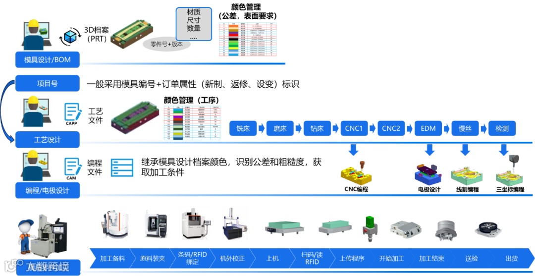 通常在模具设计端,PLM通过与CAD软件的集成,自动生成BOM,并通过结构化的系统管理,实现版本的准确配置。通过物料关联生产订单的方式,结合工艺与计划,准确下推加工程序和最新版本的档案,保证现场加工参考源头的准确性。更深度的应用,可以通过对设计软件中档案参数的获取,来自动生成对应工艺与数控加工条件,也可以通过颜色管理等特殊手段,直观地反映出加工要求。