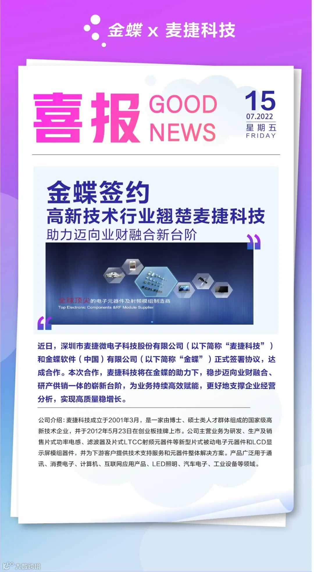 近日,深圳市麦捷微电子科技股份有限公司(以下简称“麦捷科技”)和金蝶软件(中国)有限公司(以下简称“金蝶”)正式签署协议,达成合作。本次合作,麦捷科技将在金蝶的助力下,稳步迈向业财融合、研产供销一体的崭新台阶,为业务持续高效赋能,更好地支撑企业经营分析,实现高质量稳增长。