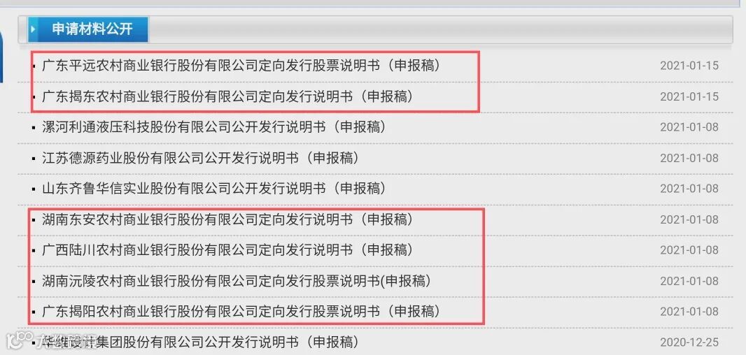 除此之外,1月15日,证监会还公布广东平远农商行、广东揭东农商行定增说明;1月8日披露湖南东安农商行、湖南沅陵农商行、广东揭阳农商行、广西陆川农商行定增说明书申报稿。