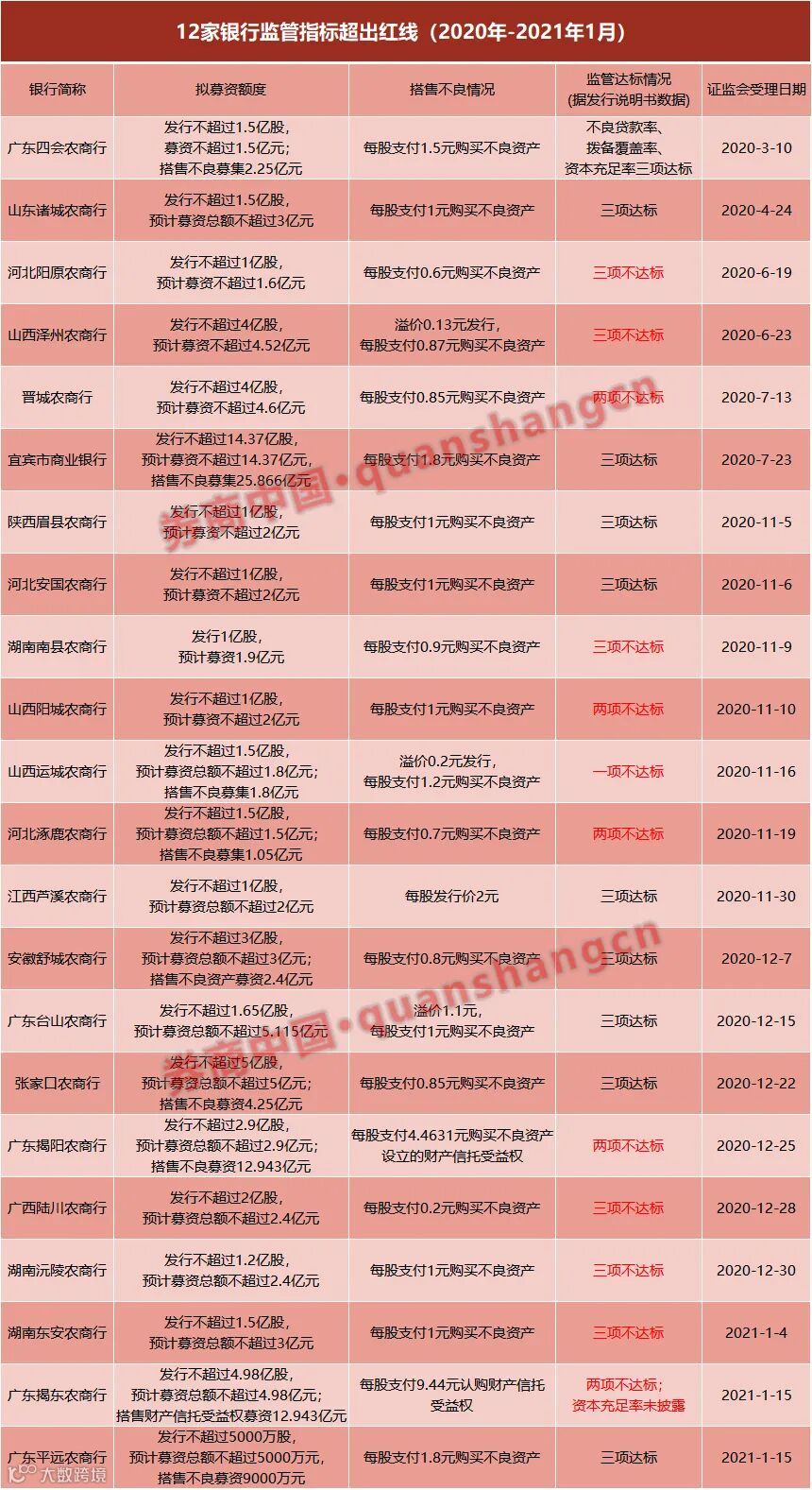 据券商中国记者统计数据,在2020年提交定增计划且附有搭售条款的19家中小银行中,有10家银行的监管指标超出红线。除此之外,2021年披露的湖南东安农商行、广东揭东农商行部分指标超出要求。