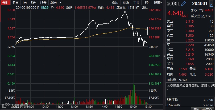 与此同时,交易所市场的交易品种也出现波动,国债逆回购品种GC001大幅上行,盘中冲高回落,最终收于4.64%,较上一交易日上行166.5个基点。