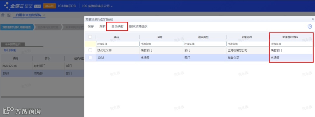 同时可通过部门级未来预算组织与现行部门的映射,系统罗列出新增的部门级预算组织,通过【部门映射】将部门级预算组织与实体部门进行关联映射,进行组织架构变更的检查,以保证后续未来组织架构启用后,新增的部门级预算组织能够正常的进行预算控制以及分析。同时也对未来架构下相关数据的检查以及未来标识的更新,避免遗留组织、部门,以确保组织架构调整的完整性。