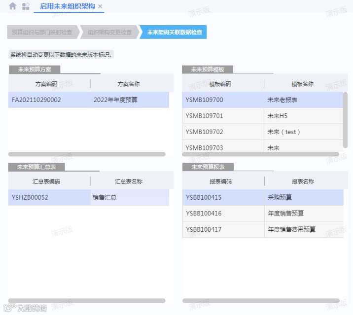 组织架构调整完成,相关方案、模板、预算表均制作完成,可进行预算编制工作了,系统提供了关联数据检查检查功能,自行罗列出关联的预算方案、模板、预算表以及汇总表,自动绑定为新的预算组织架构相关,大大方便了后续编制预算工作。后续未来架构的启用,这些方案、报表以及数据的未来版本标识,也将在向导完成时,一次性自动刷新为非未来版本,即所有在未来架构下创建的组织架构、预算方案、报表都将切换到正常的预算组织架构、预算方案、预算编制台下,查询和使用。