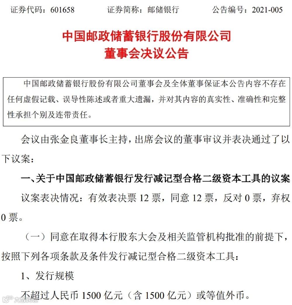 1月28日,邮储银行公告称,董事会通过了《关于中国邮政储蓄银行发行减记型合格二级资本工具的议案》(下称“议案”)同意在取得该行股东大会及相关监管机构批准的前提下,按照相关条款及条件,发行不超过1500亿元的二级资本工具。