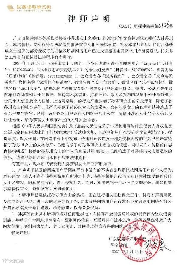 小小莎在1月27日作出最新回应:《遭遇中介全网网暴150小时后,我想说......》。