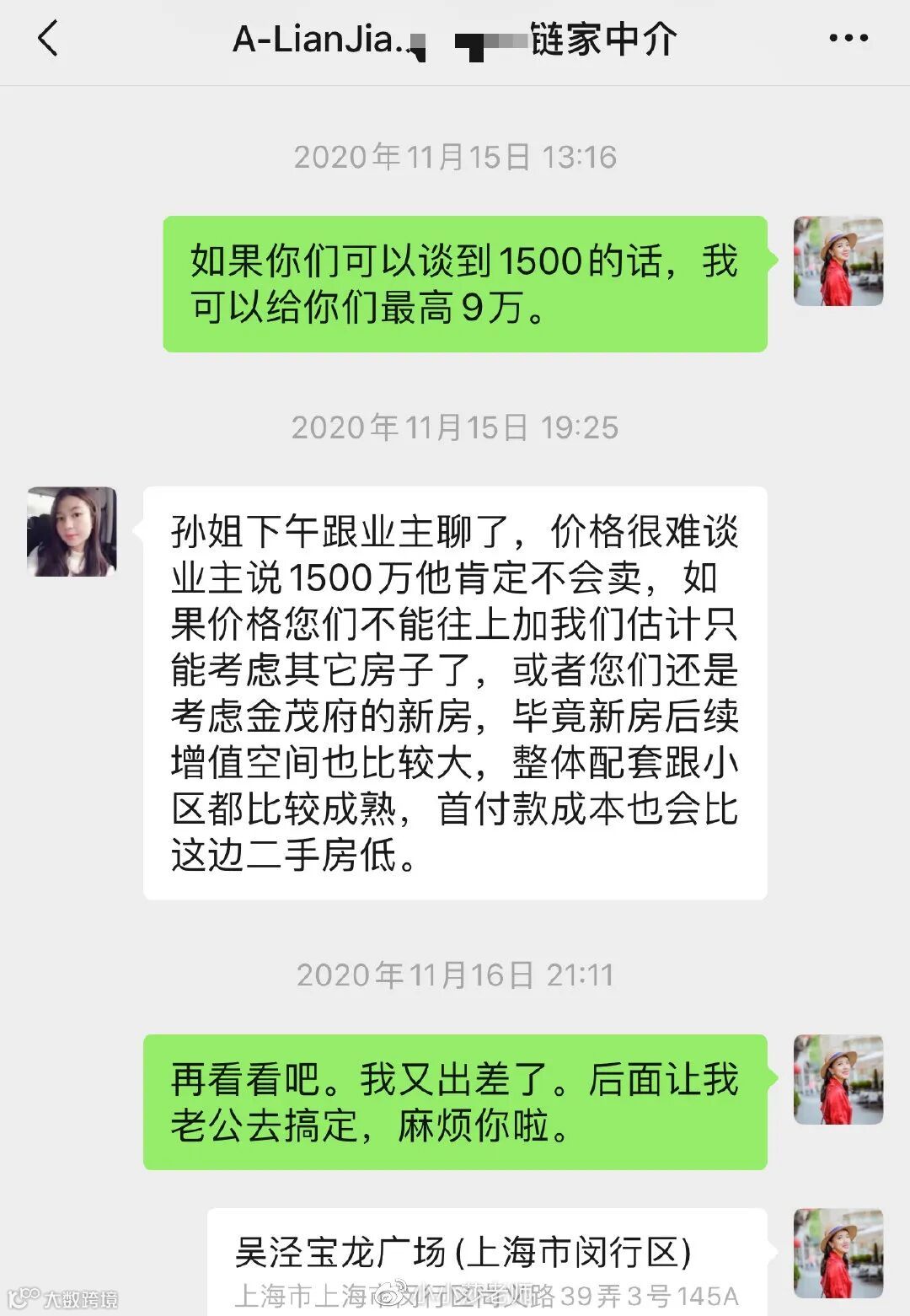 事情是这样的,链家的中介朱小姐为小小莎带看了一套报价1620万的房子,但双方并没有就价格问题达成一致。