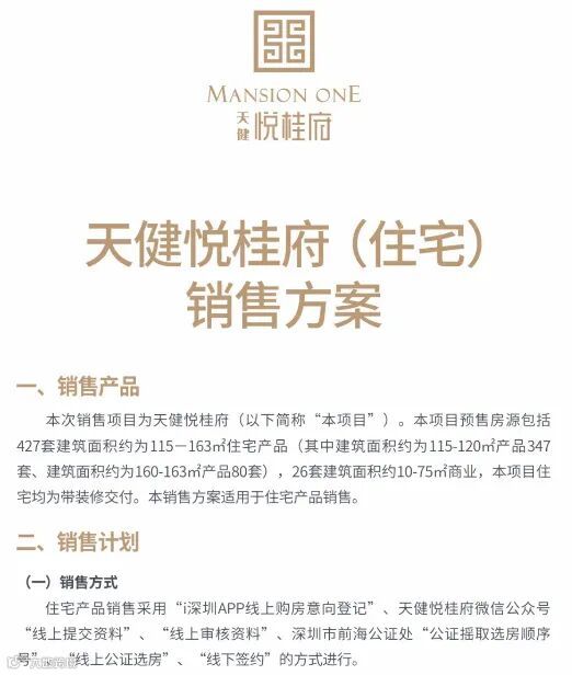 1月19日,天健悦桂府和天境前海花园先后发布了住宅销售方案。本次采用线上公证选房的方式,还是无房者优先,认筹金都是300万。