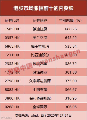 总的来看,港股市场涨幅前十的内资股(总市值超过百亿元人民币)年度涨跌幅介于688.26%至306.05%之间,平均值为442.42%。