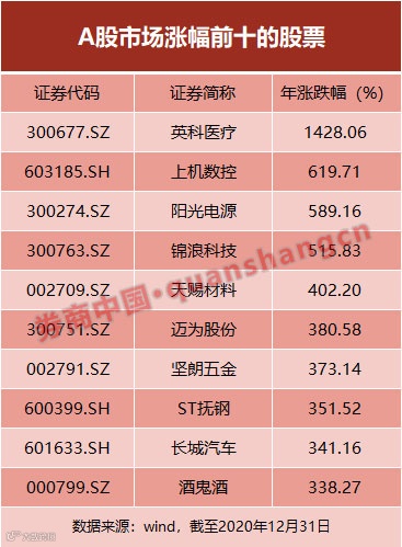 上机数控(603185)、阳光电源(300274)、锦浪科技(300763)涨幅均在5倍以上,分别位列第二至第四名。值得一提的是,在年内异常坚挺的白酒板块中,酒鬼酒(000799)成为表现最佳的个股,年度累计涨幅338.27%。值得注意的是,2020年全年白酒股整体市值几乎翻了一倍,暴涨25000亿元。