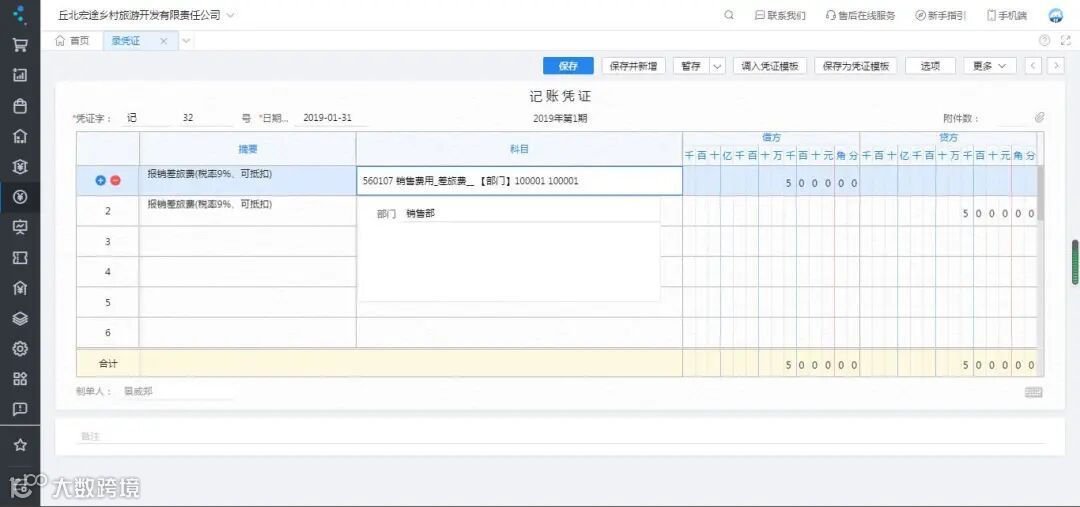 金蝶用户单击“账务处理”的“录凭证”录入损益类会计凭证时,在损益类会计科目上选择对应的部门,如图所示。