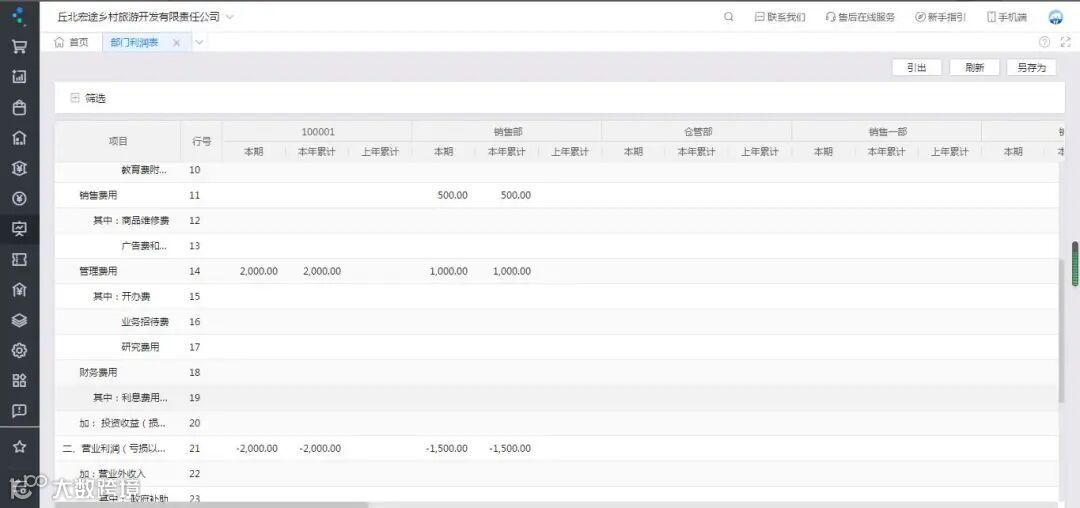 金蝶用户单击“财务报表”的“部门利润表”,选择“部门”和“数据类型”,单击“查询”,进入“部门利润表”页面,如图所示。