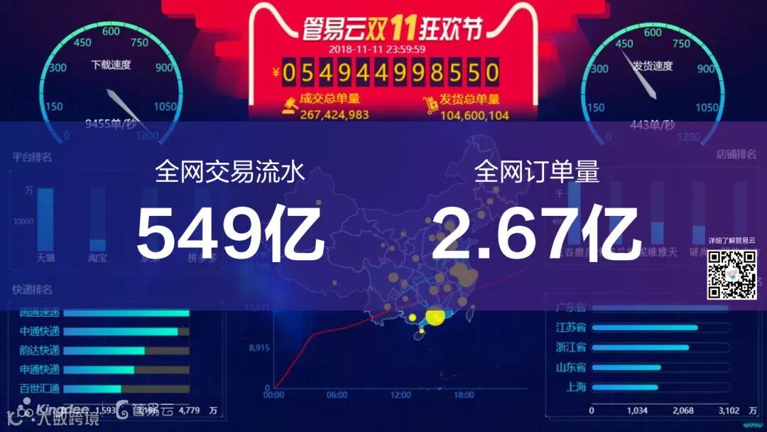 作为金蝶集团旗下专注于电商SaaS的服务商,管易云创业十年,与客户共同创新成长。2018年双十一管易云全网交易额549亿,同比增长20.4%;全网订单量2.67亿单,同比增长24.2%。天猫预测,2018年双十一物流订单量预计超10亿单,大致相当于美国20天的包裹量、英国4个月的包裹量,这些包裹连接起来可以绕地球赤道7圈多,这其中每10个包裹有2个是经由管易云的系统应用处理并发出。