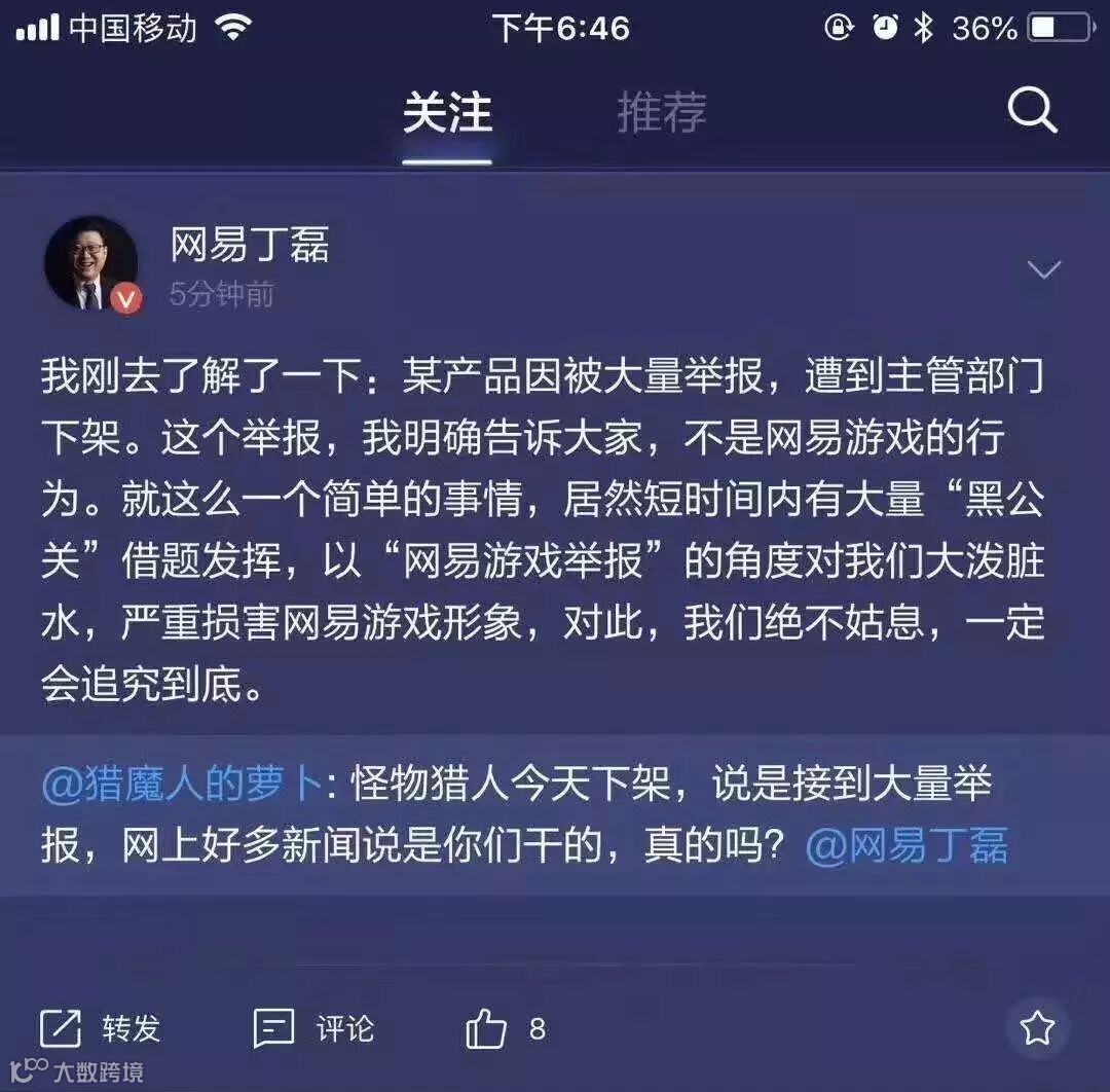 针对网上流传的网易游戏举报腾讯《怪物猎人:世界》的传闻,丁磊作出回应,称举报事件与网易游戏无关,并称会对「黑公关」泼脏水追究到底。