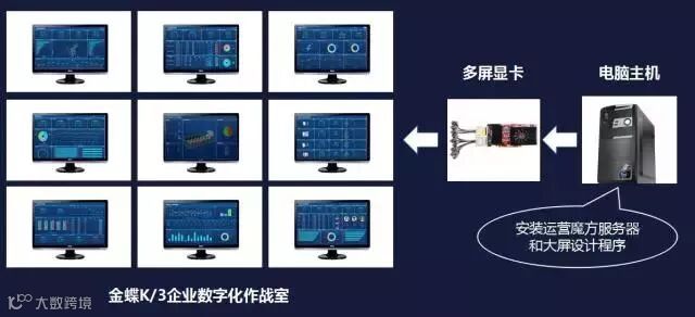 传统模式:N块大屏需要配N台电脑,线路不仅杂乱不堪之外,还需要投入大量的人力物力。更重要的是不能做数据实时联动钻取更新(图片动画展示),档次还不高。