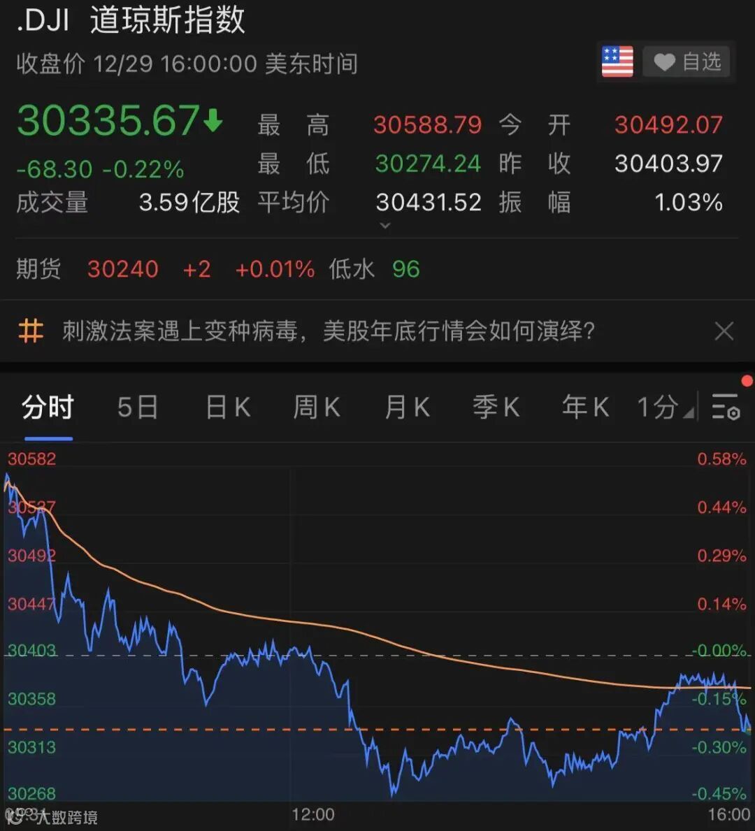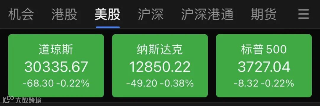截至收盘,标普500指数收跌8.32点,跌幅0.22%,报3727.04点。道琼斯工业平均指数收跌68.30点,跌幅0.22%,报30335.67点。纳斯达克综合指数(纳指)收跌49.20点,跌幅0.38%,报12850.22点。标普500及道指均止步三连阳。