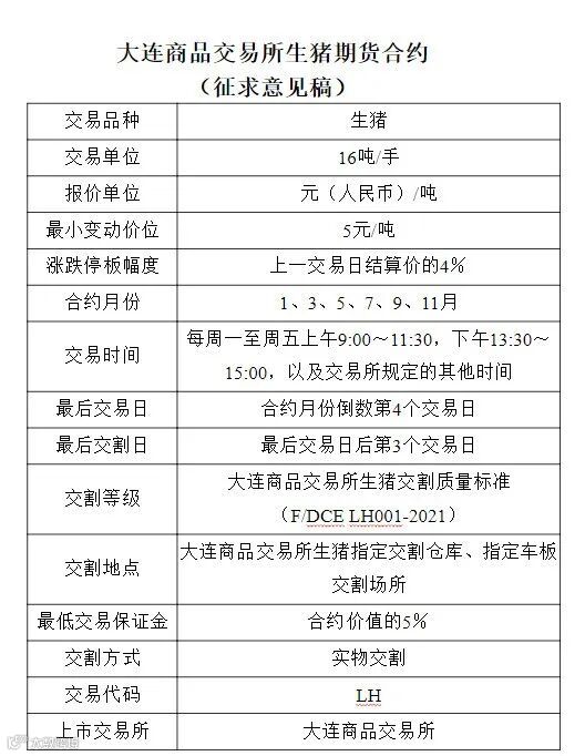 根据公告,生猪期货合约的交易代码为LH。生猪期货交易单位为16吨/手,涨跌停板幅度为上一交易日结算价的4%,最低交易保证金为合约价值的5%。