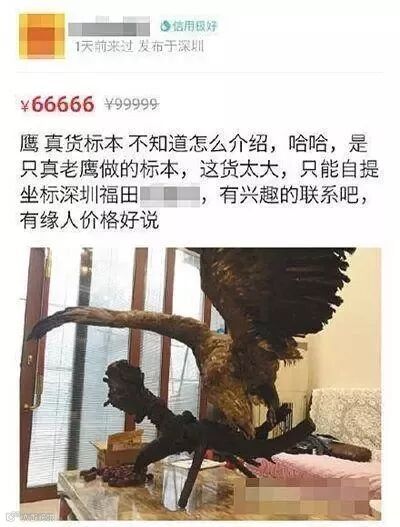 近日,有网友发微博称,深圳福田有人通过「闲鱼」二手交易平台公开售卖老鹰标本。卖家对所售物品的描述是「真老鹰做的标本」。从卖家提供的图片上看标本头部、尾部、脚爪等细节,疑似国家一级保护动物白尾海雕。随后记者调查发现,闲鱼、转转、拼多多、58 同城等平台均有售卖国家保护动物活体和标本。有部分商家表示,自己所售野生保护动物均是在山上捕捉。