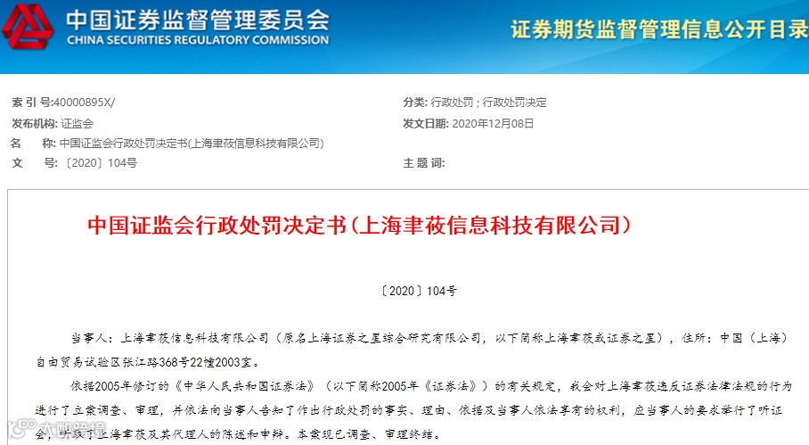 证监会最新下发的行政处罚书显示,因违规将“荐股软件”销售业务委托给不具有证券投资咨询业务资格的陈某健代理,证监会对上海聿莜信息科技有限公司(简称“上海聿莜”,原名上海证券之星综合研究有限公司)进行行政处罚,合计罚没7240.85万元。该公司是证券之星的关联公司,两者的实控人均系王晓明。