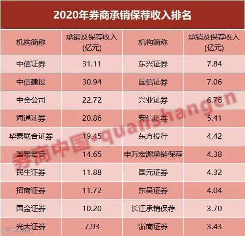 其中,中信证券和中信建投成为仅有的两家承销保荐收入超30亿的券商,收入分别为31.11亿元和30.94亿元。紧随其后的是中金公司和海通证券,两家券商的承销保荐收入超过20亿元,分别为22.72亿元和20.86亿元。华泰联合证券、国泰君安、民生证券、招商证券和国金证券的承销保荐收入都在10亿至20亿之间。排名第十的光大证券2020年的承销保荐收入已经是7.93亿元。几个梯队之间的差距已经出现,龙头“马太效应”明显。
