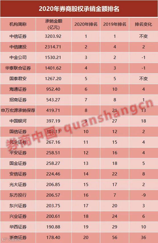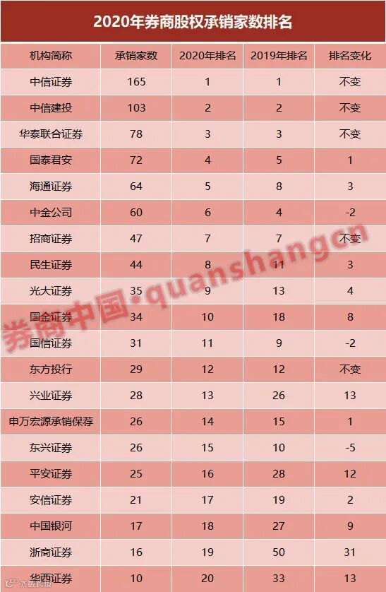 如果看2020年总承销家数,中信证券以全年承销165家稳居第一,中信建投2020年承销了103家。兴业证券、平安证券、浙商证券、华西证券在股权投行承销家数排名上都进步逾10位。