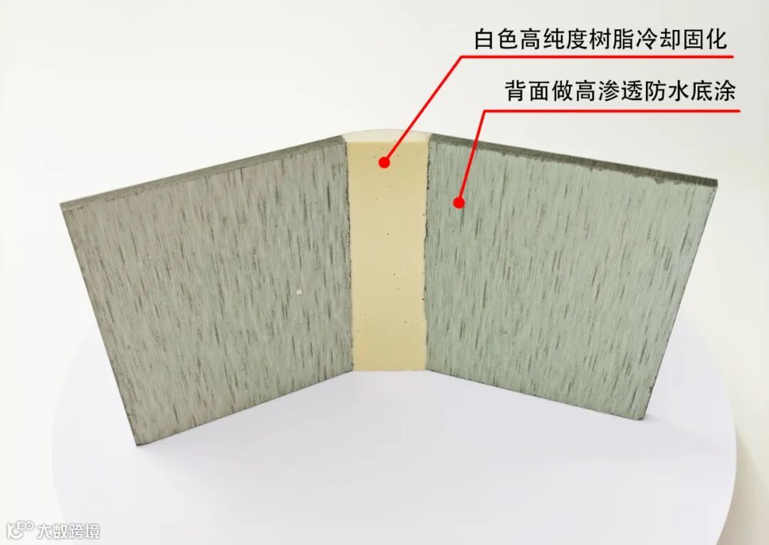 将高密度石英纤维板背面做高渗透防水底涂,再将0.25mm超柔防火板与高密度石英纤维板分别裁切成条,在模具内定位成型,将石英纤维板与弯曲防火板弯曲位填充白色高纯度树脂冷却固化。