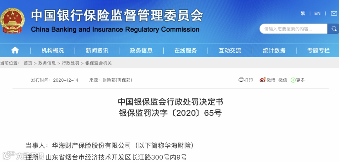 12月14日,银保监会发布2020年第65号罚单,处罚对象是华海财险。理由是华海财险在增资申请中存在股东隐瞒关联关系、提供虚假材料,以及存在公司治理不规范问题。根据法律法规有关规定,银保监会对华海财险罚款51万元;对相关责任人警告并罚款10万元。