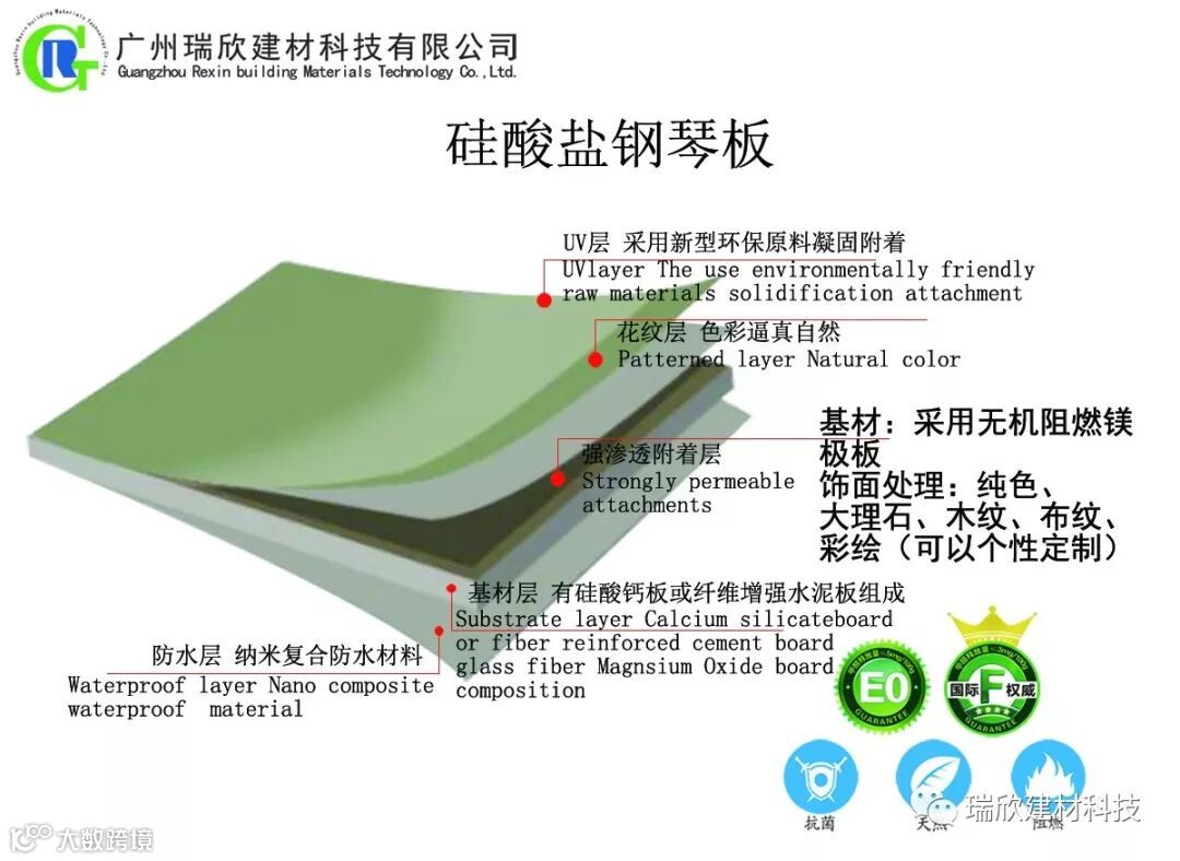 广州瑞欣建材科技有限公司研发的硅酸盐钢琴板是一种新型室内装饰材料,该产品具有防火、防水、防腐蚀、耐温变、无毛细孔、易清理保养、施工便捷等优点。产品现已进入市场,得到了用户的一致好评,被誉为绿色、低碳、节能、环保的新型饰面板材,替代传统的木质板材、大理石、瓷砖等装饰材料。广泛应用于地下隧道、地铁、医院、市政建设各个领域,适用于住宅、商场、写字楼、宾馆、酒店、娱乐场所、机场等对防火、环保、防潮、防霉防菌要求较高的室内场所装饰。