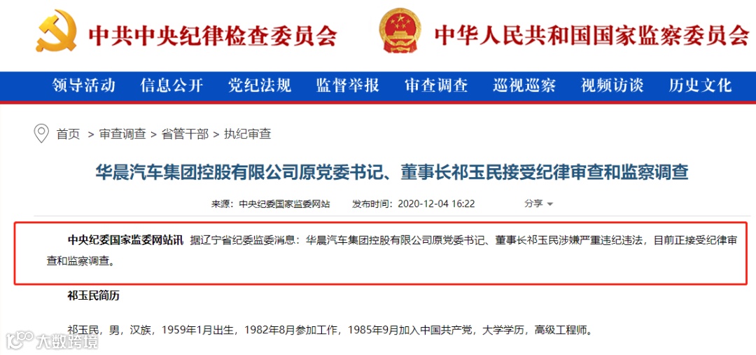 12月4日,围绕华晨集团,事件又有了新进展。据辽宁省纪委、监委消息,华晨汽车集团控股有限公司原党委书记、董事长祁玉民涉嫌严重违纪违法,目前正接受纪律审查和监察调查。