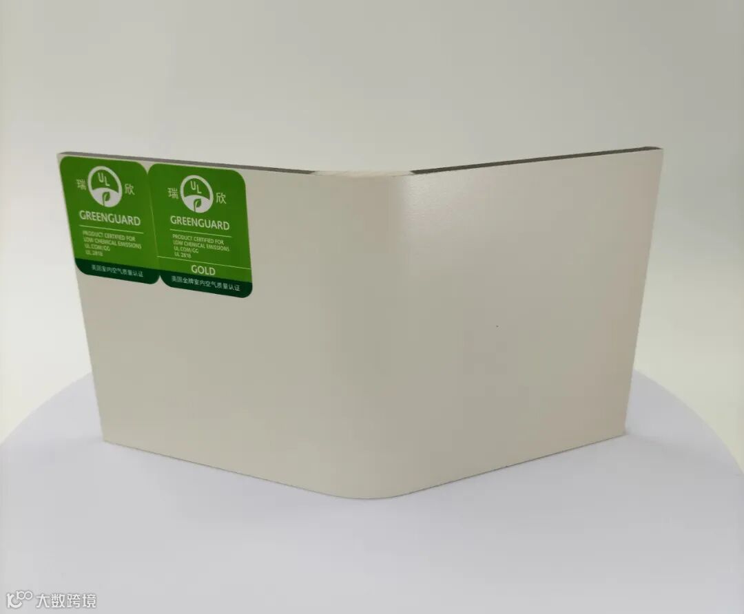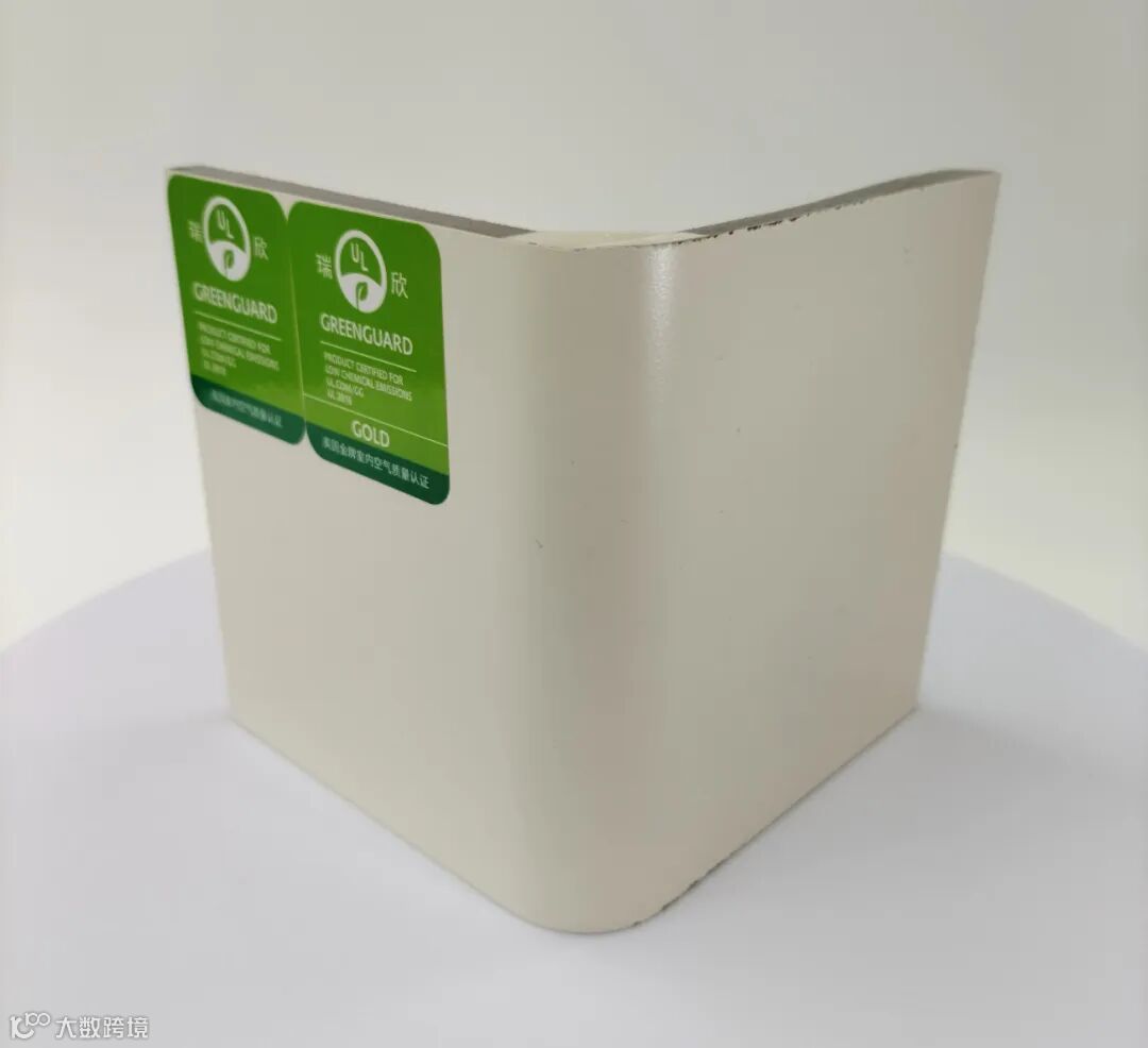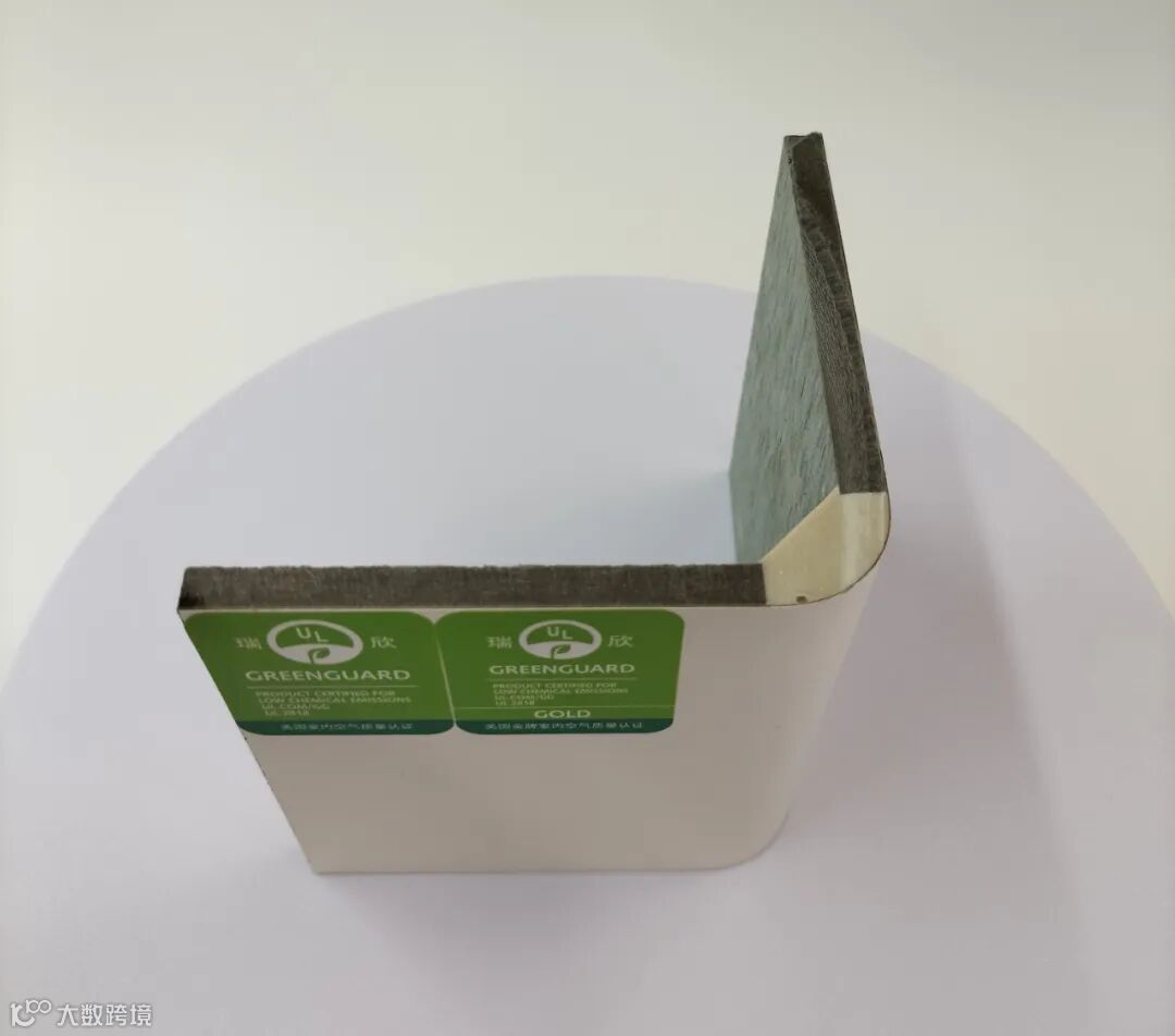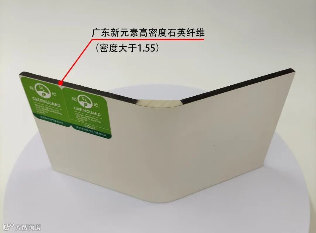 将高密度石英纤维板背面做高渗透防水底涂,再将0.25mm超柔防火板与高密度石英纤维板分别裁切成条,在模具内定位成型,将石英纤维板与弯曲防火板弯曲位填充白色高纯度树脂冷却固化。