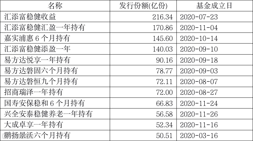 具体来看,今年发行的“固收+”中,募集规模超百亿的达到5只,此前较多的是汇添富稳健收益、汇添富稳健汇盈一年持有、嘉实浦惠6个月持有、汇添富稳健添盈一年。还有不少产品募集规模超50亿,基本是偏债混合型基金。