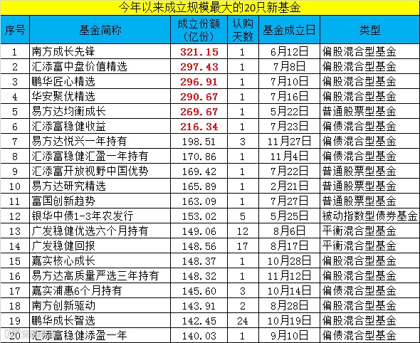 部分“固收+”基金的“吸金”效应丝毫不弱于权益基金,易方达基金今日公告,易方达悦兴一年持有期混合基金首发规模达到198.51亿元,成为今年首发规模第7大的新基金。