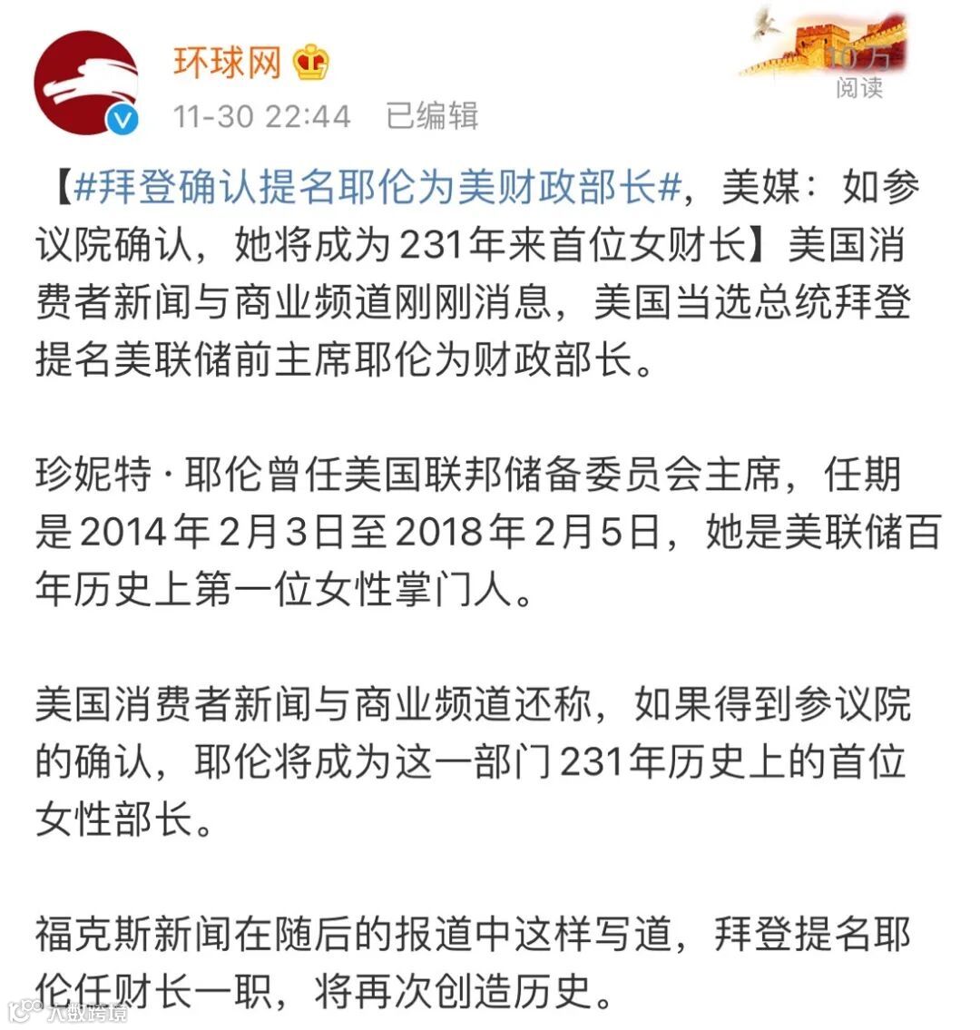 福克斯新闻在随后的报道中这样写道,拜登提名耶伦任财长一职,将再次创造历史。