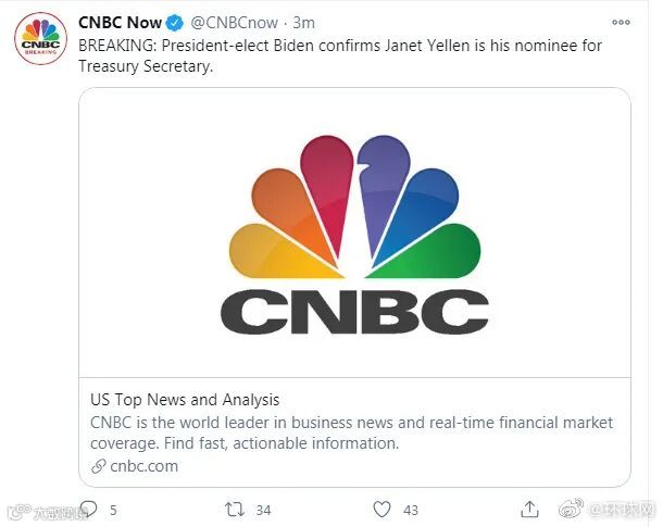 美国消费者新闻与商业频道刚刚消息,美国当选总统拜登提名美联储前主席耶伦为财政部长。
