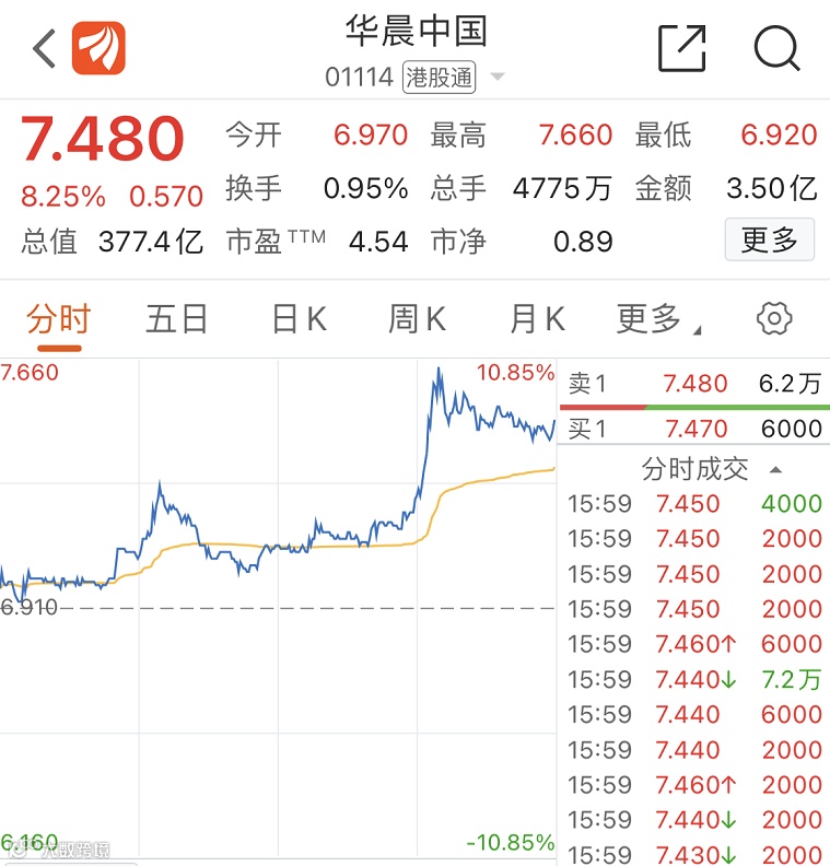华晨中国短线上扬,盘中涨幅扩大至近10%,截至收盘,股价报收7.48港元,收涨8.25%。A股市场方面,申华控股和金杯汽车涨停。