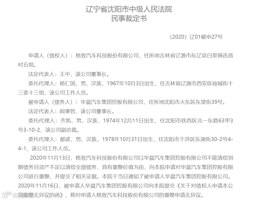 11月13日,格致汽车科技股份有限公司以华晨集团不能清偿到期债务且资产不足以清偿全部债务、具有较高重整价值为由,对华晨汽车提起申请破产重整
