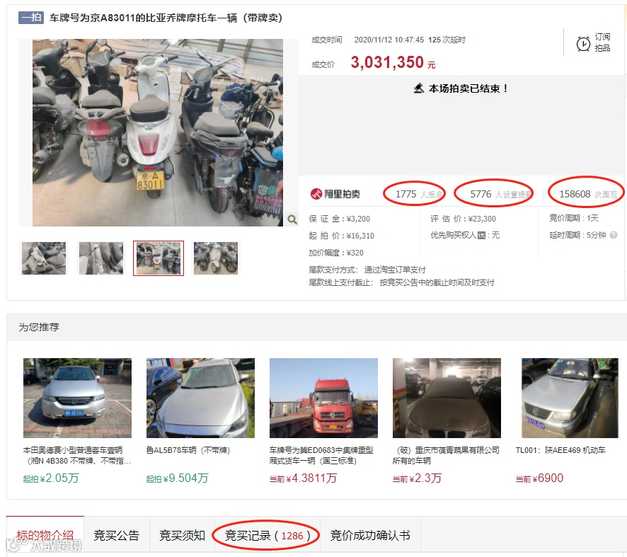 阿里拍卖最新信息显示,这两摩托车拍卖有这场拍卖有1775人报名,5776人设置提醒,有超过15万人次围观。