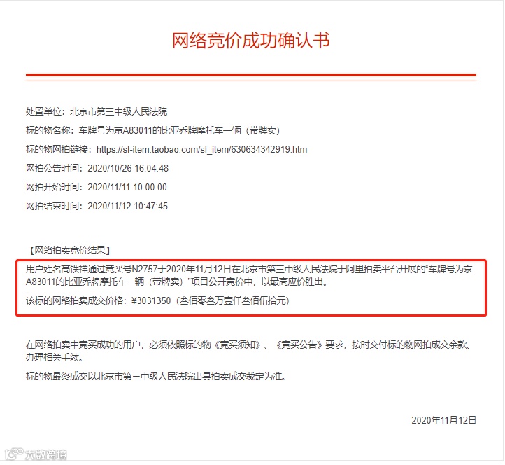 阿里拍卖网站显示,北京市第三中级人民法院对一辆车牌号为京A83011的比亚乔牌摩托车进行公开司法拍卖。