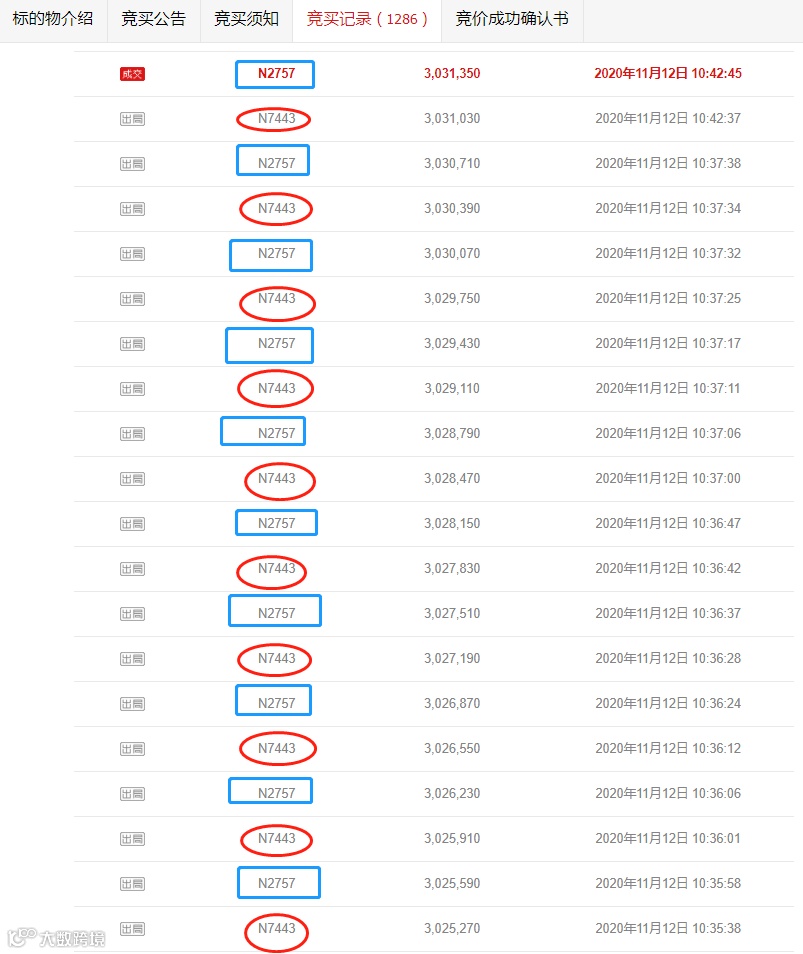 以11月12日,10时35分38秒至竞拍结束的11月12日10时42分45秒,短短7分钟左右,只有竞买号为N2757和N7443的2名买家,他们在这7分钟内分别报价10次,处于你追我赶的互相较劲态势。