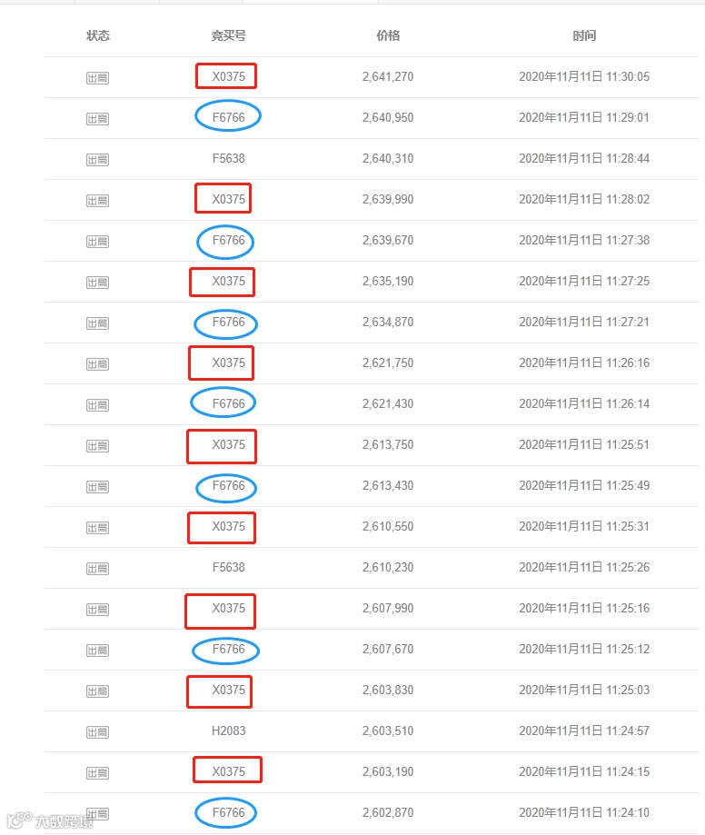 同样的状况也出现在11月11日11时24分11秒至11时30分为例,短短6分钟内,竞买号F6766和X0375分别报价7次和9次,竞买价格从260.28万元提高到264万元,260.31万元提高至264.12万元。