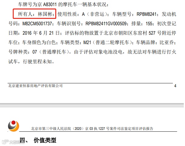 北京市第三中级人民法院项目评估报告显示,该辆摩托车持有人为林国彬。